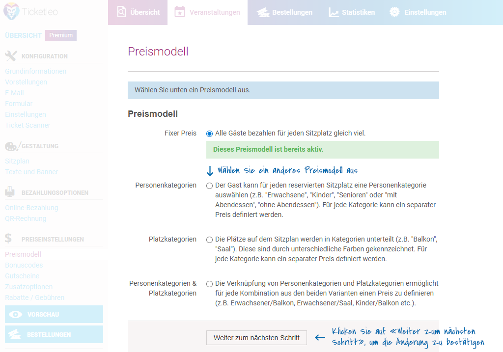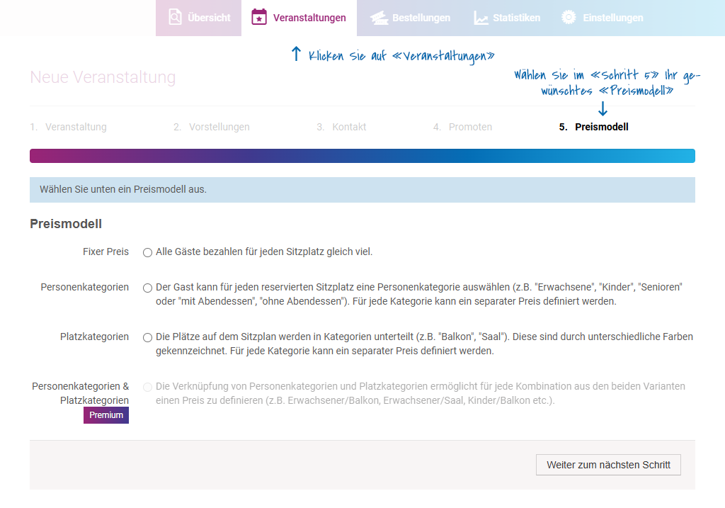 Die Auswahl des Preismodells erscheint beim Anlegen einer neuen Veranstaltung (Veranstaltungen – Neue Veranstaltung anlegen – Schritt 5: Preismodell)